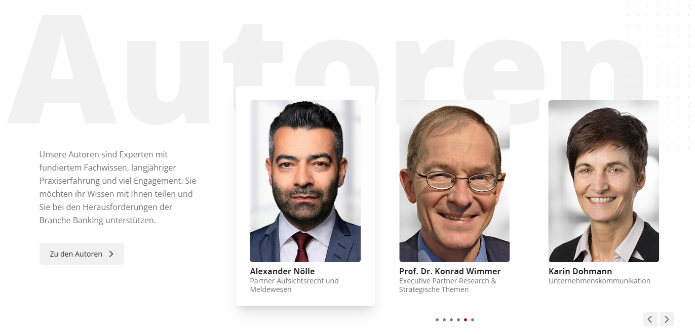 Unsere Autorinnen und Autoren sind Experten mit fundiertem Fachwissen, langjähriger Praxiserfahrung und viel Engagement. Sie schreiben über aktuelle Entwicklungen im Aufsichtsrecht & Meldewesen, im Risikomanagement, in der Banksteuerung, in Payments, im Software-Engineering und über viele weitere aktuelle und relevante Themen der Branche Banking.
