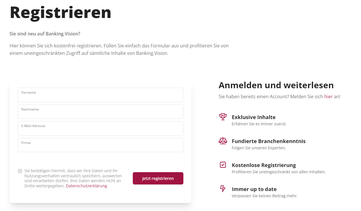 Banking.Vision ist kostenlos, aber ausgewählte Inhalte sind unseren registrierten Usern vorbehalten. Das heißt, mit einer Registrierung profitieren Sie von exklusiven Inhalten und haben Zugriff auf alle Inhalte von Banking.Vision, wie zum Beispiel