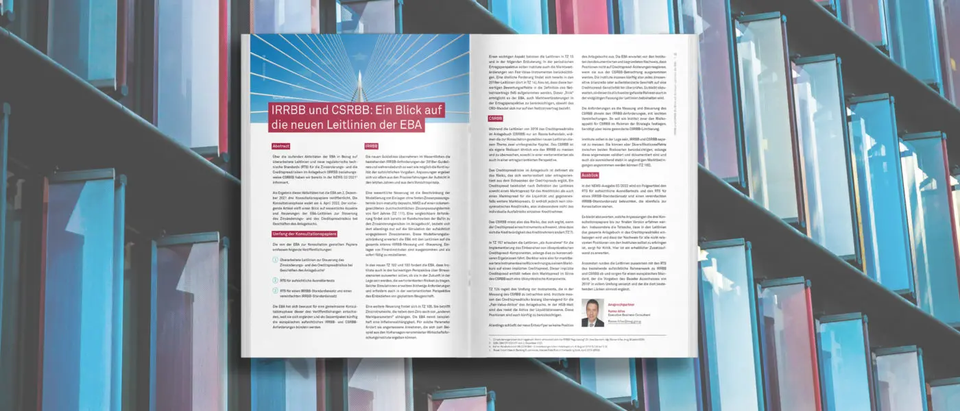 In der NEWS-Ausgabe 02/2022 wird ein Folgeartikel den RTS für aufsichtliche Ausreißertests und den RTS für einen IRRBB-Standardansatz und einen vereinfachten IRRBB-Standardansatz beleuchten, die ebenfalls zur Konsultation stehen.