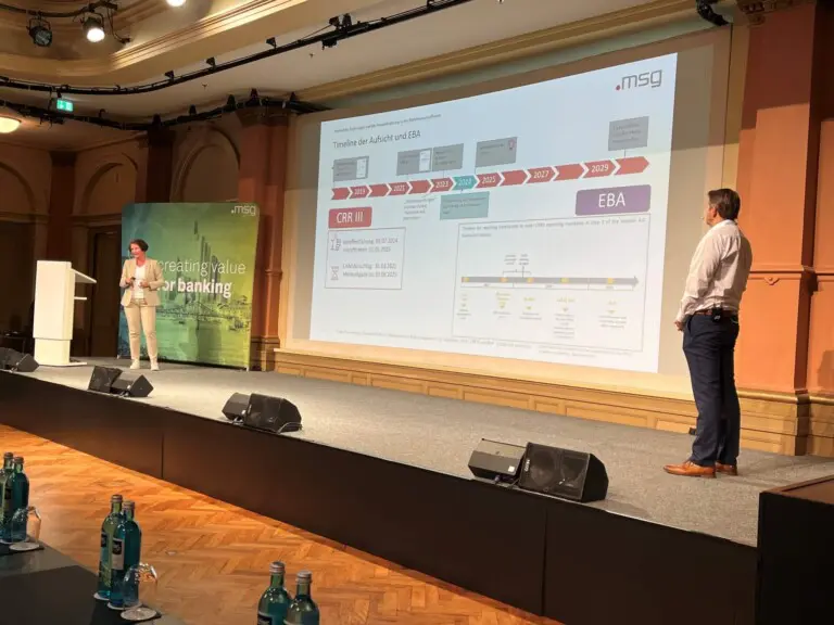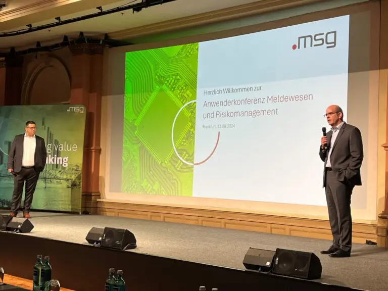 Eröffnet wurde die Veranstaltung von den beiden Geschäftsbereichsleitern Matthias Gahr und Christoph Prellwitz (msg for banking ag), die in ihrer Begrüßung sowohl die Tradition der Konferenz betonten als auch die Inhalte der Agenda vorstellten.